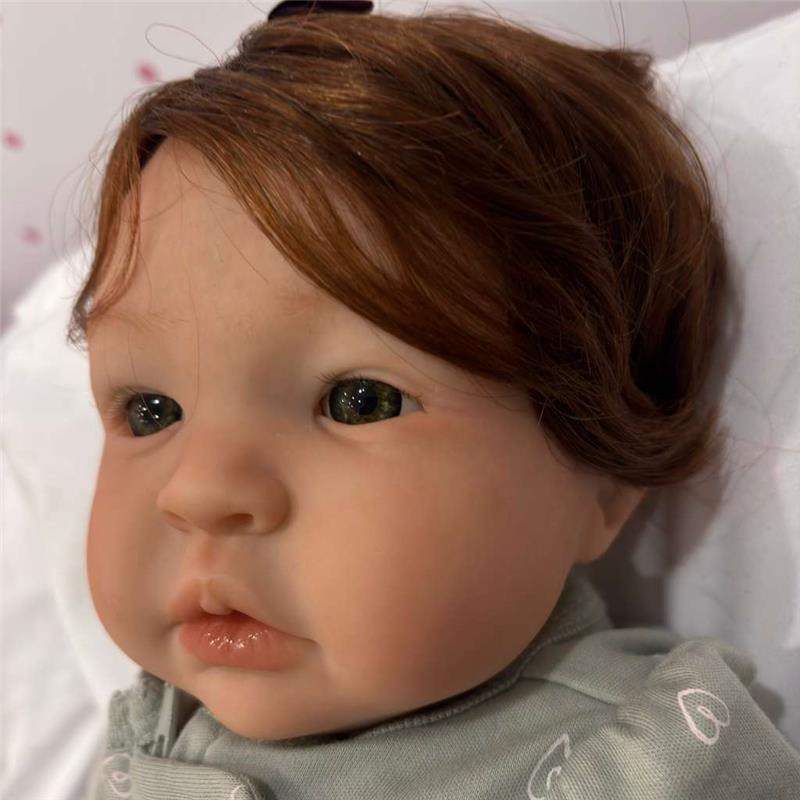 This beautiful white baby doll reborn has painted hair and closed eyes.